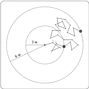 Рис. 2.1. Случайное блуждание иногда называют «прогулкой пьяницы», вызывая в воображении образ опьяневшего завсегдатая бара, который выходит за порог заведения, спотыкается на каждом шагу и падает, но каждый раз поднимается и бредет неизвестно куда. Для случайных блужданий характерен тот факт, что расстояние от изначальной точки возрастает пропорционально квадратному корню из числа шагов. В данном случае «клиент» находится в трех метрах от начала пути после 5 шагов и в 6 метрах от начала после 52 = 25 шагов