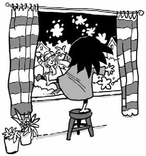 Войдя в гостиную, она увидела, что Фиасоль в пижаме у окна, убрав с подоконника цветочные горшки, со смехом бегает взад-вперёд. За окном на снегу тепло одетый Ингольвюр Гойкюр кидает снежки в сторону окна.