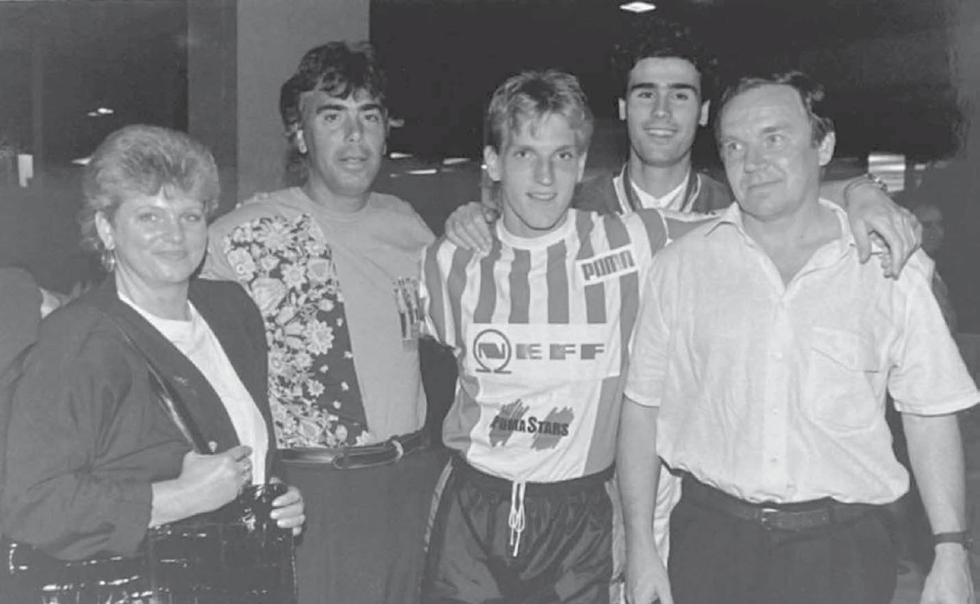 Andi Herzog zwischen Mutter und Vater und zwei italienischen Fans und Freunden bei der WM 1990