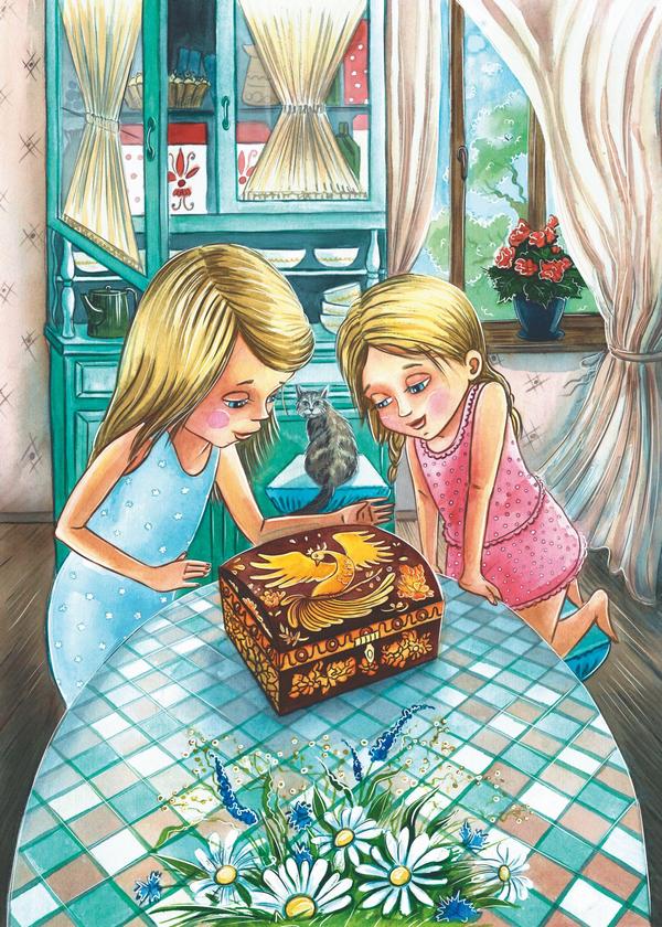 Сёстры стали внимательно рассматривать шкатулку. На её крышке была нарисована жар-птица, а по бокам – красивые цветы. Замок оказался очень прост, и девочки с лёгкостью его открыли.