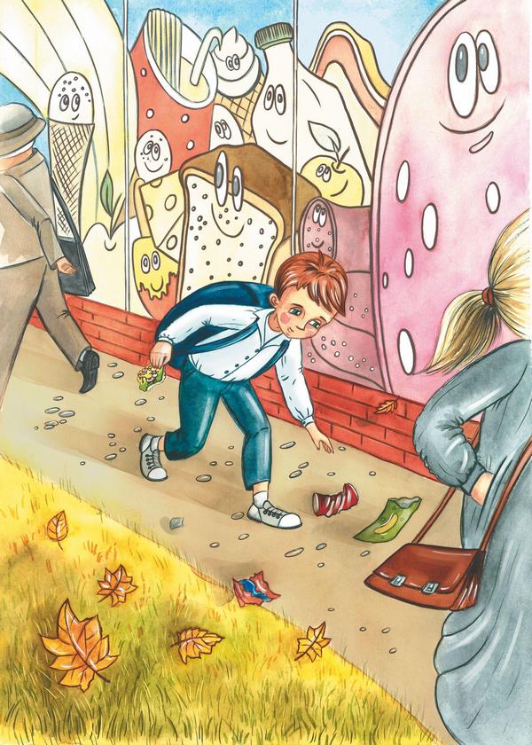 Немало удивившись такому поведению взрослых, Паша решительно направился к дорожке и поднял свой улетевший фантик. Затем он поднял остальные обёртки от конфет и шоколадок, несколько упаковок из-под чипсов и даже пустую алюминиевую банку, в которой когда-то была сладкая газировка.