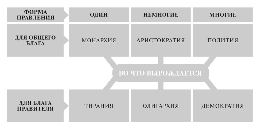 Аристотель, впитавший идеи Платона, давал ученикам задание собрать сведения о известных на тот момент политических системах городов-государств. Получилась таблица – шесть способов, которыми управлялись полисы, сгруппированных по тому, кто правит и чье благо ставится во главу угла. В верхнем ряду расположены три «правильных» формы правления; в нижнем – форма, в которую может выродиться каждая из них. Аристотель усматривал причину поражения Афин в Пелопоннесской войне в крайней форме их демократии. Сам он считал демократию искаженной формой политии, которая, как он полагал, предоставляла наилучшие возможности управления в интересах большинства в течение наиболее длительного периода времени.