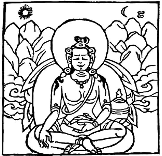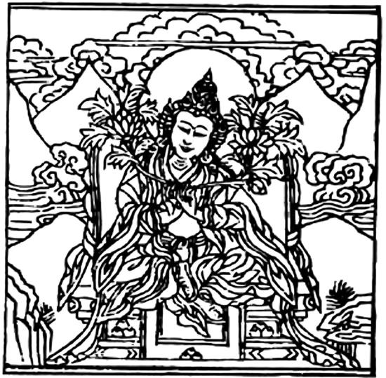 На десятый день своего пути на юг они дошли до огромного леса. Тогда царь напустил на них глубокий сон и велел нечеловеческим существам незаметно перенести их по небу в рощу Малая[40], прямо к мандале, что была там воздвигнута Сучандрой. Проснувшись, они весьма удивились. Тогда министр Сагарамати[41]разъяснил им символизм мандалы, а затем по просьбе Сурьяратхи и прочих мудрецов дал посвящение в мандалу мудрости и прочитал текст, известный как «Калачакра-лагху-тантра», в краткой форме передающий основные положения коренной тантры.
