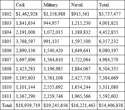This, however, seems to have been beyond his power. Few finance ministers have ever pressed their economies with more perseverance or authority than Mr. Gallatin, but he never succeeded in carrying on the government with so much frugality as this, and the sketch seems to indicate what the Administration would have liked to do, rather than what it did. The report of the Secretary of the Treasury a month later shows that he had been obliged to modify his plan. As officially announced, it was as follows: