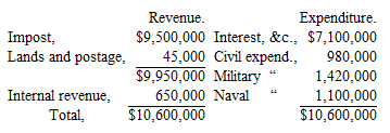 Of the residue of income, which, without the internal taxes, was estimated at about $2,700,000, the civil expenditure was to require one million, the army and navy the remainder. But the tables of actual expenditure show a very different result: