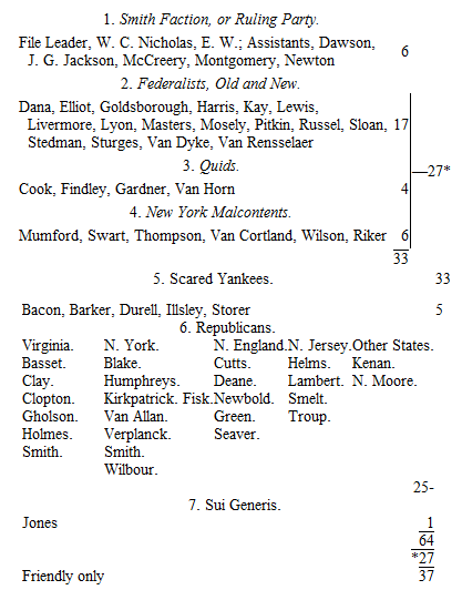 “Mr. Robert Smith was appointed. This dictation to Mr. Madison, effected by a very small knot of association in the Senate, operating by influence over that body chiefly when in secret session, bears a strong resemblance to that which was exercised over the same body in 1798 and 1799, with this difference, that the prime agents of the faction were not then members of the body, and now they were.