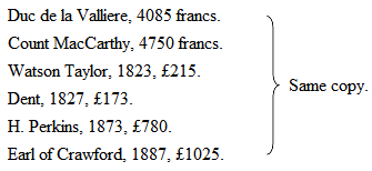 Three on vellum—(1) Royal Library, Madrid; (2) Royal Library, Turin; (3) supposed to have been reserved for the Cardinal. Pinelli, 1789, £483, bought by MacCarthy. MacCarthy, 1817 £676 (16,000 francs), bought by Hibbert. Hibbert, 1829, £525.