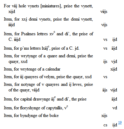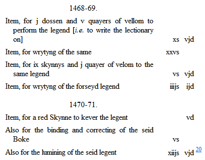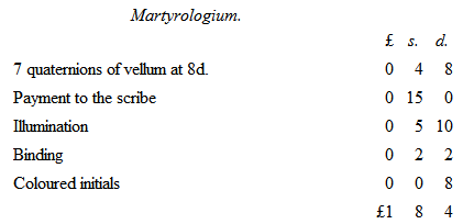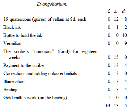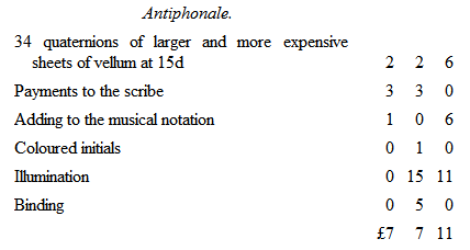 “From these accounts (1379-1385) we learn that six manuscripts were written, illuminated, and bound, one of them with gold or silver clasps or bosses, at a total cost of £14, 9s. 3d., more than £150 in modern value” (p. 222). “Three Processionals only cost £1, 17s. 4d., being on forty-six quaternions of cheap parchment made of sheepskin, which cost only 2½d. the quaternion” (p. 223).