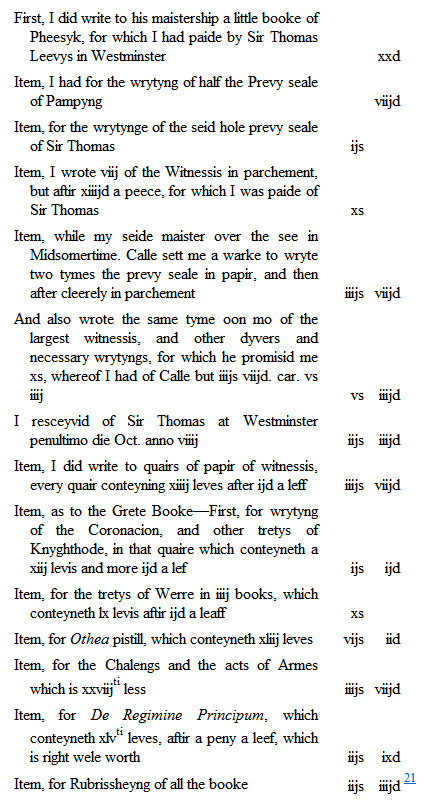 Among the Paston Letters is a letter from William Ebesham to his “moost worshupfull maister, Sir John Paston,” 1469 (?), asking for payment for his labours in writing, the charge for which was a penny per leaf for verse, and twopence a leaf for prose. Appended to this letter is the following interesting account:—