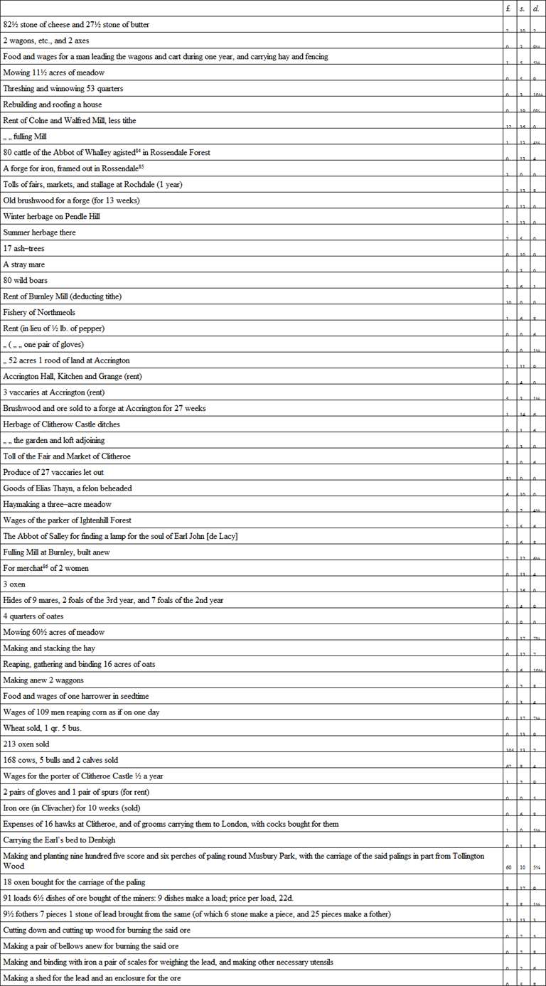 Clitheroe Castle, though perhaps never a very extensive fortification, is one of the oldest foundations in the county, probably dating back to Saxon times. It stands in a commanding situation on the summit of a rock rising out of the plain, about a mile from Pendle Hill; in Domesday Book it is described as the Castle of Roger (Roger de Lacy). Of the original building nothing is now left but the keep, a square tower of small dimensions. The honour dependent upon this castle extended over a very large area, part only of which is in Lancashire; it included Whalley, Blackburn, Chipping, Ribchester, Tottington (in Salford Hundred), and Rochdale, and consequently the manors of all these places were at one time held of the castle of Clitheroe. Henry de Lacy, second Earl of Lincoln and great–grandson of Roger de Lacy, was born in 1250, and, like his ancestor, he made this castle his Lancashire stronghold and residence, and here each year his tenants and the stewards of the various manors attended his courts to render in their accounts and offer the suit and service required. The town of Clitheroe must, on the occasions when the Earl was at the castle, have put on a festive appearance, as the lord of the honour is said to have assumed an almost regal state. Several of the accounts of the stewards, parkers, and other servants of the Earl have fortunately been preserved, and we are by them enabled to get a glimpse at the social life of the Lancashire people between the years 1295 and 1305.81 We find that, besides the forests of Pendle, Accrington, Rossendale and Trawden, there were parks at Ightenhill and Musbury, well stocked with deer. There were over twenty vaccaries, or breeding farms, all of which added to the Earl’s income. On the estates were iron forges, and iron smelting was practised, and of course coal was dug up from the seams lying near the surface.