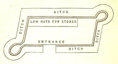 At each of these places there is a small enclosure, it cannot be called a fort, in which the commissariat stores are placed. General Stewart refused to garrison the smaller of these with our troops, but left them in charge of native levies who the civil authorities assured him were perfectly trustworthy. The value of this opinion has been very conclusively shown by the events of the past week. Each enclosure or fort is like the other, except in size, some being larger than others. They are of the following shape: —