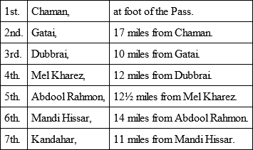 Sunday, April 18th.– Before continuing my story it will be as well to explain that between the Khojak Pass and Kandahar, the road is divided into 6 stages, as follows: —
