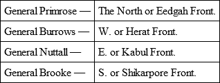 August 6th.– At 3 a.m. every man was turned out and occupied the post he would hold in case of attack, to ascertain that all knew their places. Everything was very quietly done, and the arrangements worked well. The working parties in front of my gate were much annoyed by the enemy firing at long distances. One officer, Lieut. De Trafford, 7th Fusiliers, was wounded. We brought down a mortar and cleared out one of the most troublesome villages. Ayoob Khan's Camp was observed to be pitched behind Picquet Hill in the old Cantonments.