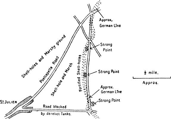 It will be obvious that, since my tanks could not leave the road, and the direct road was blocked, it had become necessary to use the main road across the enemy front and attack the strong points down the road from the north. Further, the tanks could not move out of St Julien before "zero" in case the noise of their engines should betray the coming attack. We were reduced, in consequence, to a solemn crawl along the main road in sight of the enemy after the battle had commenced.