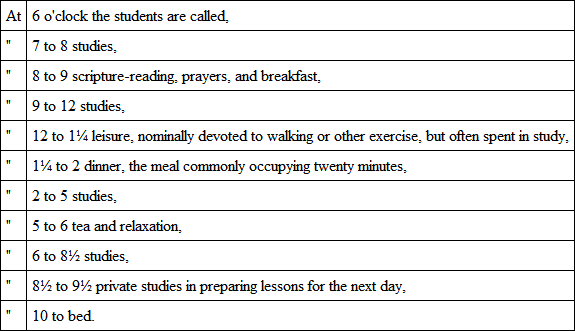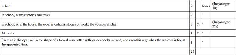 It may be that since 1833, when this was written, some improvement has taken place. We hope it has. But that the system is still common – nay, that it is in some cases carried to a greater extreme than ever; we can personally testify. We recently went over a training-college for young men: one of those instituted of late years for the purpose of supplying schools with well-disciplined teachers. Here, under official supervision, where something better than the judgment of private school-mistresses might have been looked for, we found the daily routine to be as follows: —