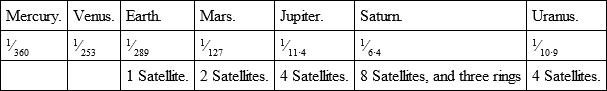 Two insurmountable objections are presented by this series. The first is, that the progression is but a broken one. Neptune is denser than Saturn, which, by the hypothesis, it ought not to be. Uranus is denser than Jupiter, which it ought not to be. Uranus is denser than Saturn, and the Earth is denser than Venus – facts which not only give no countenance to, but directly contradict, the alleged explanation. The second objection, still more manifestly fatal, is the low specific gravity of the Sun. If, when the matter of the Sun filled the orbit of Mercury, its state of aggregation was such that the detached ring formed a planet having a specific gravity equal to that of iron; then the Sun itself, now that it has concentrated, should have a specific gravity much greater than that of iron; whereas its specific gravity is only half as much again as that of water. Instead of being far denser than the nearest planet, it is but one-fifth as dense.