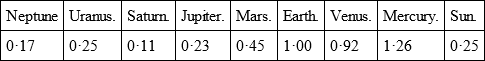 The fact that, speaking generally, the denser planets are the nearer to the Sun, has been by some considered as adding another to the many indications of nebular origin. Legitimately assuming that the outermost parts of a rotating nebulous spheroid, in its earlier stages of concentration, must be comparatively rare; and that the increasing density which the whole mass acquires as it contracts, must hold of the outermost parts as well as the rest; it is argued that the rings successively detached will be more and more dense, and will form planets of higher and higher specific gravities. But passing over other objections, this explanation is quite inadequate to account for the facts. Using the Earth as a standard of comparison, the relative densities run thus: —