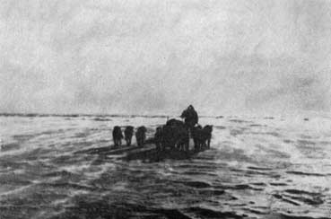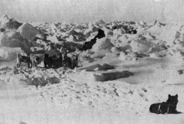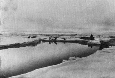 В гаснущем свете мы увидели, что полоса, на которой мы находились, отделилась, дала новые трещины, сходящиеся под прямыми углами, и пространство, где можно было передвигать собак и нарты, сократилось до размеров небольшой льдины 60 на 80 футов. Пути к спасению не было ни к востоку, ни к западу, ни к югу; единственный выход для нас – это путь через торосистое поле, простиравшееся к северу. С помощью хорея мы заставили собак перепрыгнуть через разводье; а тех из них, что не решалась это сделать, мы кидали или сталкивали в воду, и они вынуждены были плыть, судорожно загребая лапами, несколько футов. Все нарты, пока собаки тащили их через разводья, на мгновенье окунулись в воду, но снаряжение не намокло. Тут мы снова разбили палатки в сотне ярдов от только что покинутого места. К этому времени наступила кромешная тьма.