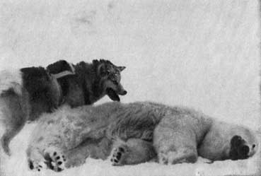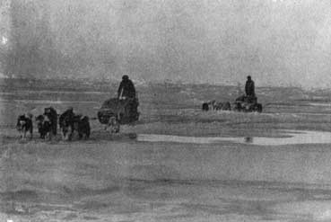 Погода и ледовая обстановка ухудшились, снег стал глубоким и липким, тучи заволокли небо. Приходилось прорубать себе путь вперед часто при такой видимости, когда лед, небо и горизонт нельзя отличить одно от другого. Мы продвигались по взломанному льду и торосистым полям. Это был путь, которого мы не видели даже в зоне битого льда у берегов Аляски. Через каждые несколько миль то и дело попадались разводья. В среднем мы проходили всего 2 мили в день; иногда были вынуждены превращать наши нарты в лодки, чтобы переправить собак и груз через разводья, которые нельзя было пересечь на ледяных плотах или перейти по мосткам из обломков льда, отколовшихся при сжатиях. На 80° с. ш. мы оказались в безвыходном положении: течение уносило нас в нежелательном направлении – на северо-восток.