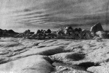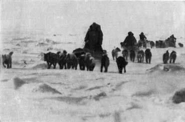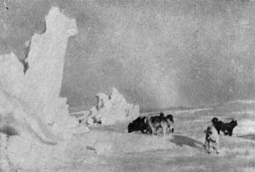 Тускло освещенный северным сиянием надвигающийся ледяной вал напоминал обвалившуюся алебастровую стену. У ее основания бурлило черное море. Когда громадные глыбы соскальзывали вниз и тяжело ударялись о ледяное поле, мы ощущали глухие толчки. Шум становился все громче, а силуэт ледяного вала все выше… Мы чувствовали теперь запах моря. В отчаянной спешке мы побросали груз на нарты и привязали его. В одно мгновение собаки были запряжены, и под громкие крики и проклятия вереница нарт двинулась к усеянному торосами, исковерканному ледяному полю, простиравшемуся к югу от нас.