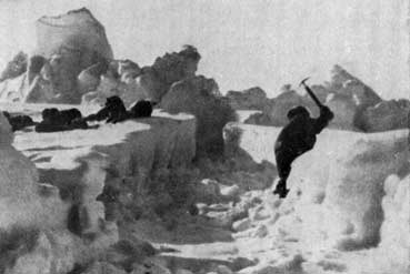 Санный переход, проделанный нами для выполнения первого задания, был очень тяжелый; к середине дня 25 февраля мы забрались на самую высокую ледяную скалу, чтобы обозреть лед к северу от нас. Вид был неутешительный: там, насколько хватал глаз, царил полный хаос, и казалось, что, кроме той дороги, по которой мы пришли, никакой другой не существует. Остаток этого дня и весь следующий мы прорубали путь на север и перетаскивали нарты через ледяные валуны, движущиеся льдины и огромные торосы. Ночью 25 февраля мы разбили лагерь на тонком льду. Ночью 26-го две наши палатки были установлены в 100 ярдах от ледяной гряды, которая составляла южную стену канала, забитого обломками торосов и большими глыбами льда. Никакого движения, никакой шуги, никаких следов воды не было. Полоса битого льда, залитая в тот вечер розовым заревом заката, казалась вполне спокойной; но мы не сомневались, что дальше к востоку должна существовать более сносная дорога.