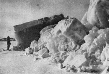Под вечер мы достигли полосы ровного льда, которая утром еще выступала в виде мыса, далеко выдвинувшегося в море открытой воды. Противоположный берег открытого пространства стал подступать к нам, но течение шло в другом направлении со скоростью около трех узлов, и в точке соприкосновения льдов, смывавших открытую воду, возникало внушительное нагромождение торосов. Огромные пластины льда толчками вздымались вверх по склонам двадцатифутовой движущейся ледяной стены. Все это сопровождалось зловещими стонами и скрипом. По мере того как этот ледяной гребень двигался вперед по обломкам ледяного поля, раскалывавшегося под его напором, глыбы льда весом несколько тонн, переваливая через его вершину, скатывались по противоположному склону и падали с глухим грохотом. Скорость движения льда и его направление казались нам довольно постоянными, и мы, пройдя 200 ярдов перпендикулярно линии наступления гребня, разбили лагерь.