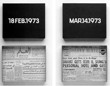 Por último, podría decirse que la temporalidad fue central para otros muchos artistas que desde el arte conceptual reflexionaron sobre la subjetividad y la identidad. Quizás el ejemplo más claro de esto es la obra de On Kawara, tanto sus Date paintings (Fig. 4), pinturas de fechas que señalaban el día de su producción, como en sus telegramas y postales realizados como marcadores temporales de la existencia, o sobre todo su One Million Years (1999), libros en los que están escritos un millón de años hacia el pasado y hacia el futuro y que hacen visible, al menos en su significado lingüístico, la metáfora de «hace mucho, mucho tiempo» o «en un futuro muy, muy lejano». El tiempo se convierte en una dimensión presente e ineludible.