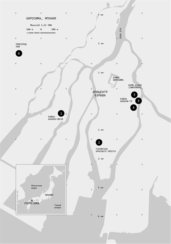 Ровно в четверть девятого по местному времени, утром 6 августа 1945 года, когда атомная бомба вспыхнула над Хиросимой, Тосико Сасаки, служащая отдела кадров Восточноазиатского завода жестяных изделий, села за рабочее место и обернулась, чтобы поговорить с девушкой за соседним столом. В тот же самый момент доктор Масакадзу Фудзии расположился на террасе своей частной клиники, которая стояла на холме над одним из семи рукавов дельты реки Ота [1]протекающей сквозь Хиросиму, скрестил ноги и собирался почитать газету Osaka Asahi [2]. Госпожа Хацуё Накамура, вдова портного, стояла на кухне и наблюдала из окна, как сосед сносит свой дом, который мешал строительству противопожарной полосы на случай авианалетов. Отец Вильгельм Кляйнзорге, немецкий священник и член «Общества Иисуса», прямо в нижнем белье прилег на раскладушку на верхнем этаже дома миссии иезуитов, чтобы почитать журнал Stimmen der Zeit [3]. Доктор Теруфуми Сасаки, молодой хирург из большого современного госпиталя Красного Креста, шел по больничному коридору с образцом крови для теста на реакцию Вассермана в руках. А преподобный Киёси Танимото, пастор Хиросимской методистской церкви, остановился у дверей богатого дома в западном пригороде Кои и приготовился разгружать тележку, полную вывезенных из Хиросимы вещей: местные жители, и он в их числе, опасались массированного налета Б-29, который вот-вот должен был обрушиться на город.