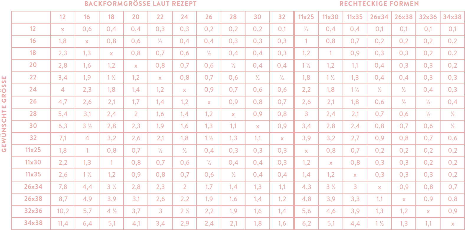 In der oberen waagerechten Zeile findet ihr die Größe, die im Rezept angegeben ist. In der linken Spalte sucht ihr die Größe eurer Backform heraus. Der Wert, an dem sich die beiden Größen treffen ist der Faktor, den ihr zur Umrechnung nutzt.