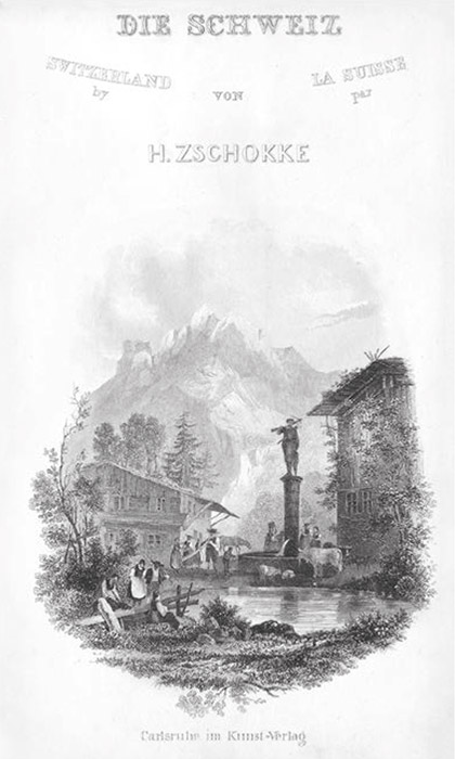 Abb. 4: Das Frontispiz der ersten Auflage von Heinrich Zschokkes Werk Die klassischen Stellen der Schweiz und deren Hauptorte in Originalansichten (1836) ziert ein Stahlstich, der das Konzept der klassischen Stellen gut ins Bild setzt – ein ländlicher Ort vor beeindruckender Kulisse, bestückt mit «typischen» Figuren und Bauten.