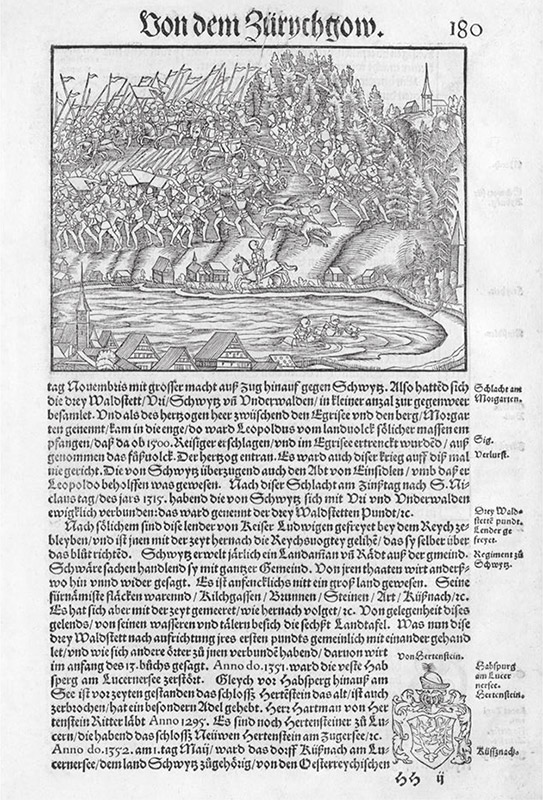 Vogtherrs Holzschnitt in Stumpfs Chronik zeigt wiederum einen See im Vordergrund – allerdings grösser als in den Vorgängerwerken und umringt von Häusern, Kirche, Kapelle und Zaun. Zwei Ritter in Rüstung schwimmen mit ihren Pferden durch den See. Ein einzelner Ritter mit geschmücktem Pferd reitet am Seeufer vom Kampfgeschehen weg, den Blick auf die schwyzerischen Kämpfer gerichtet – möglicherweise ist dies der fliehende Herzog Leopold.179 Auf dem Hang hinter dem See werfen Männer, die mit Kreuzen auf dem Rücken kenntlich gemacht sind, Steine in Richtung der mehrheitlich schon fliehenden Habsburger in Helm und Rüstung. Bei Stumpf ist die Flucht stärker betont als die Kampfhandlung.180 Die schwyzerischen Kämpfer tragen einheitliche Kleidung und eine leichte Rüstung mit Helm ohne Gesichtsvisier. Die Habsburger tragen viele kleine und grosse Fahnen mit sich, von denen jedoch alle blank sind. Ein habsburgischer Ritter und sein Pferd liegen im unteren Bereich des Schlachtfelds. Rechts am Bildrand, wo die Landschaft zerklüftet und felsig ist und Tannen statt Laubbäume wachsen, steht ein Turm, vermutlich der Schornenturm. In der rechten oberen Bildecke sind eine Kirche und ein Haus zu sehen, womöglich das Dorf Sattel.