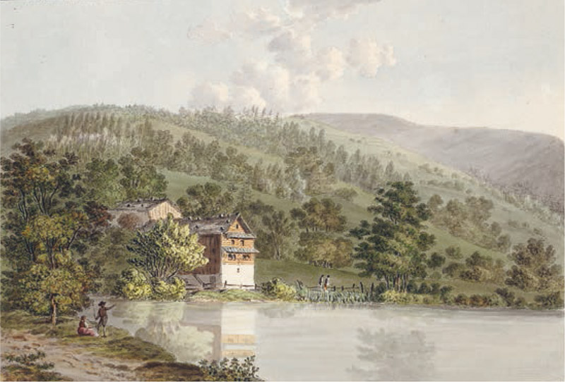 Abb. 7: Das Haus auf der kolorierten Radierung Morgarten au lac d’Ageri / Canton de Zug (1797) von Heinrich Füssli (Zeichner) und Achilles Benz (Radierer) entspricht laut Rolf E. Keller dem realen Haus Schranggen am Ägerisee.162 Beide Radierungen erschienen in Publikationen, die sich an eine touristische Käuferschaft richteten.