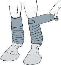 Бинтовать ноги лошади удобнее всего, если бинты заранее плотно и ровно свернуты. Крепления «липучки» при свертывании бинтов находятся внутри. При бинтовании лошадь должна стоять ровно, опираясь на ногу. Начало бинта накладывается на пястную кость вверху, под запястьем, а бинт ровно наматывается сверху вниз до путового сустава и обратно вверх, где закрепляется креплениями-липучками. При наматывании бинт укладывается слегка наискось. Если бинты закрепляются завязками, они не должны быть затянуты туже, чем сами бинты. Сухожилия-сгибатели путового сустава не должны быть перетянуты. Застежку-липучку нужно регулярно проверять на работоспособность. При бинтовании эти застежки всегда закрепляются снаружи ноги, иначе они могут расстегнуться, а бинты начнут разматываться, что может привести к падению, несчастным случаям.
