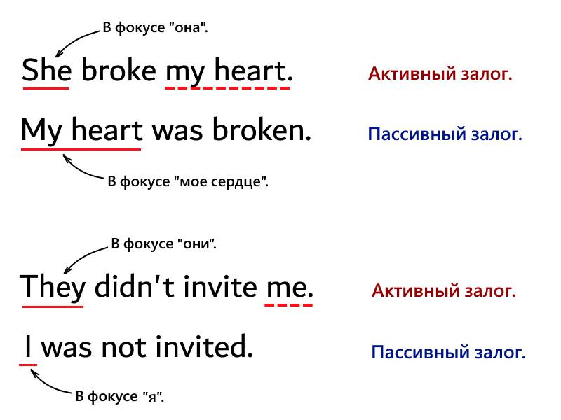 В противоположность активному залогу, в котором акцент делается на производителе действия, в страдательном залоге в фокусе оказывается пассивный объект. Сравните: