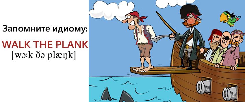 «Пройти по доске» (plank – «толстая доска», «доска обшивки корабля»). Эта идиома восходит к обычаю пиратов сбрасывать пленников в море. Пираты заставляли их идти по доске, перекинутой через борт судна, пока жертва не падала в море. В современном английском эта идиома приобрела переносный смысл и означает «быть уволенным». Например: “They would make me walk the plank if I don’t wear a tie.” – «Они уволят меня, если я не буду носить галстук».