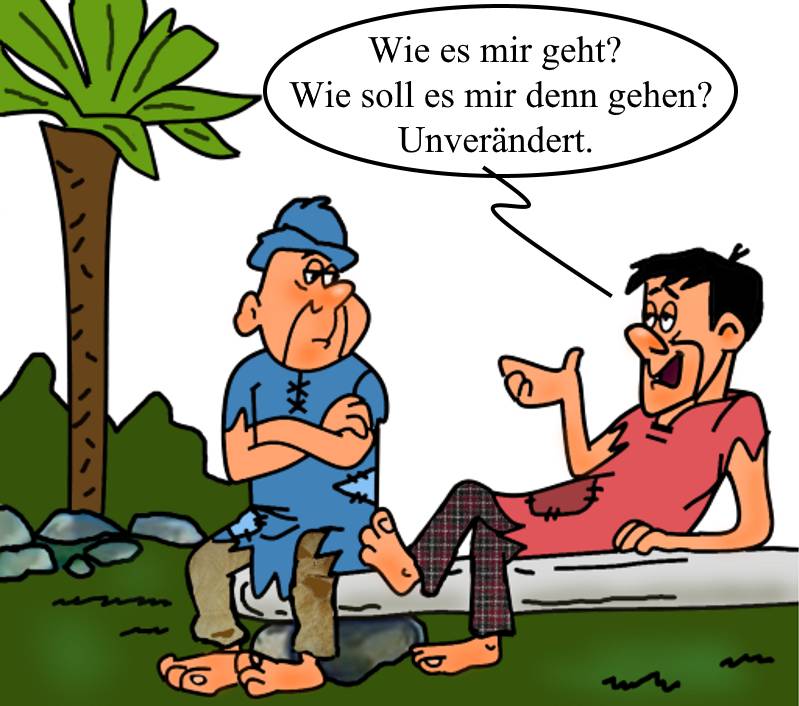 13. «Ну и как ты поживаешь? (Wie geht es dir so?)» – «Я? Да как я, по-твоему, могу поживать? Всё также (здесь: únverändert – без изменений)». – «Как твоя спина?» – «Тоже без изменений. Врачи говорят, я должен себя беречь (sich schonen), но не получается (aber das geht ja nicht)».