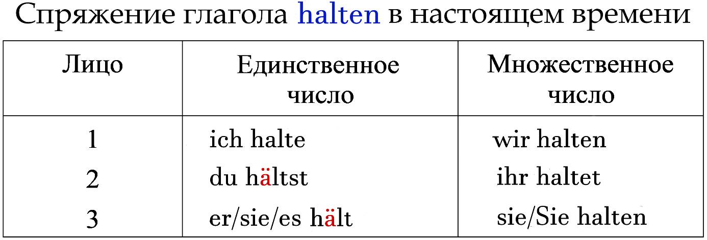 Ответьте на вопрос собеседника, но прежде внимательно изучите таблицу спряжения глагола halten.