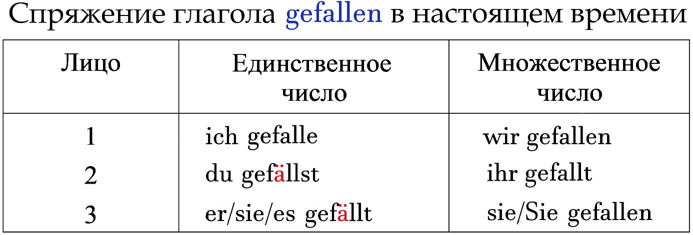 Примечание к таблице: точно также спрягаются другие глаголы с корнем fallen («падать»): einfallen («приходить на ум»), überfallen («нападать»), auffallen («бросаться в глаза») и т.д.