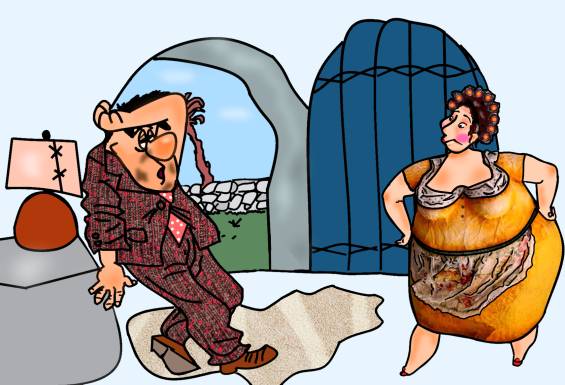 Ehefrau: Man hat dich unterwegs überfallen und ausgeraubt? Glaubst du etwa, dass ich dir diese Lüge abnehme? Wofür hältst du mich eigentlich? Für eine Idiotin?
