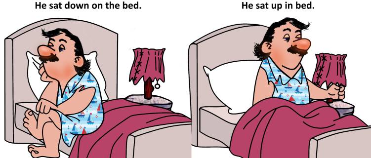 Ключ. Правильный ответ: He nervously sat up in bed. Фразовый глагол sit up означает здесь «принять сидячее положение после лежачего», то есть указывает на то, что до этого человек лежал. (Если человек до этого стоял, то он будет не приподниматься, а опускаться – sit down.) Например: “Would you like to sit up and read for a while?” – «Ты не хочешь приподняться в постели и немного почитать?» – спрашивает женщина больного супруга. В предложении We sat her up in a chair выбор фразового глагола подсказывает нам, что речь идет о больной женщине. Ее усадили в кресло; до этого, она, очевидно, находилась в постели.