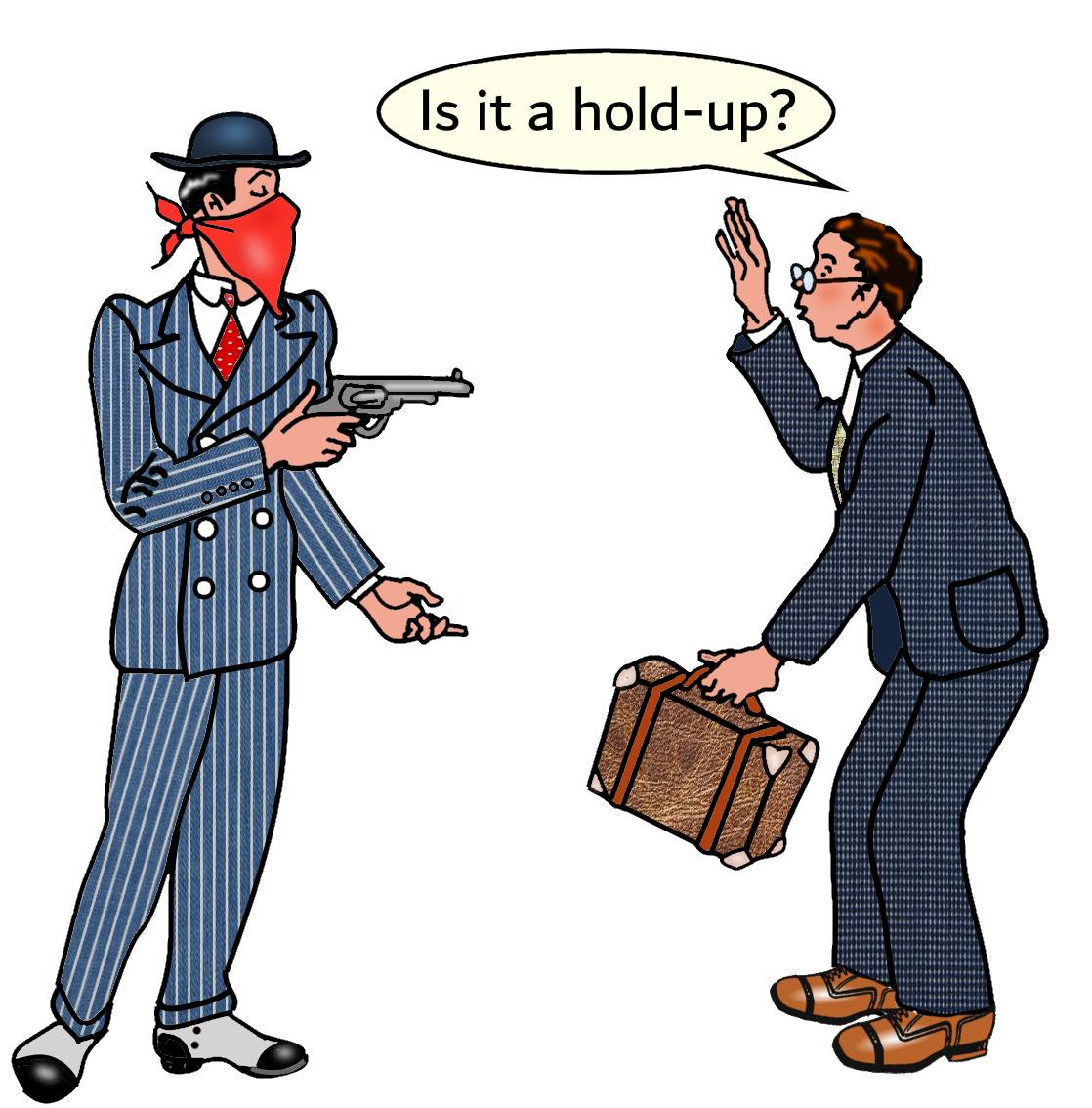 Ключ. Правильный ответ: It’s a hold-up! Фразовый глагол hold up, помимо прочего, означает «грабить», а соответствующее существительное – «вооруженное ограбление», «налет». В фильмах про налетчиков или грабителей вы можете также услышать его не менее популярный синоним – stick up. To stick up a bank означает «ограбить банк», а фраза It’s a stick-up! означает то же самое, что и It’s a hold-up! Грабить с применением оружия (hold up и stick up) можно не только банки и бензоколонки, но и людей.
