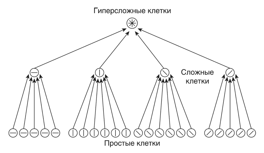 Одно из важнейших открытий в этой области сделали нейрофизиологи Хьюбел и Визель, кропотливо изучавшие работу зрения, фиксируя действия отдельных нейронов. В 1969 году они опубликовали работу, показав, как некоторые нервные клетки первичной зрительной коры (зона V1) реагируют на линии, расположенные под специфическим углом и находящиеся только в одной части зрительного поля. Эти клетки они назвали простыми. Дальнейшие исследования показали, что простые клетки реагируют на одни и те же сигналы, воспринимаемые либо левым, либо правым глазом, и что некоторые из них реагируют также на специфические волны света, или, другими словами, на специфические цвета. Эти клетки эффективно анализируют поступающую в зрительную кору информацию и обрабатывают ее основные свойства. Затем они передают ее другим клеткам, которые Хьюбел и Визель назвали сложными. Эти клетки объединяют информацию, полученную от нескольких простых клеток, в результате чего они обретают свойство реагировать на линию, расположенную под специфическим углом в любой части зрительного поля, или на линию специфического цвета, находящуюся где бы то ни было в пределах зрительного поля. Эту информацию сложные клетки затем передают гиперсложным клеткам, реагирующим на специфические формы или очертания (рисунок 3.5).