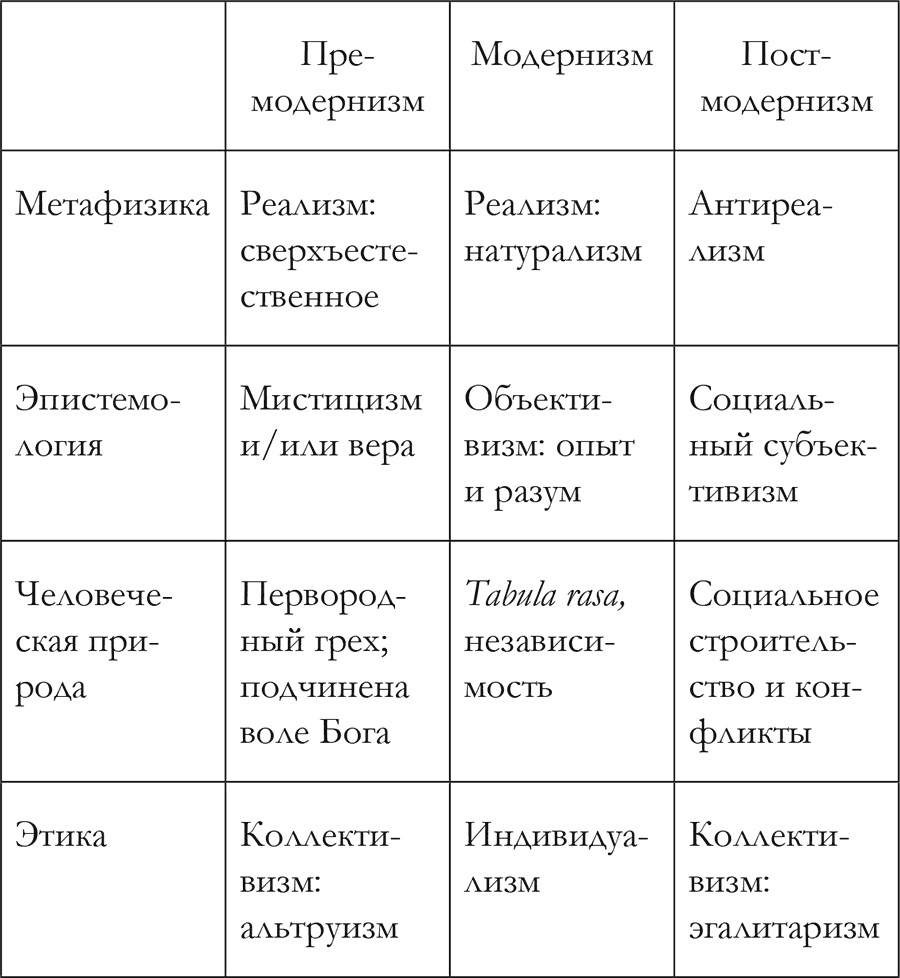Постмодернистские постулаты противоположны модернистским. Вместо естественной реальности – антиреализм. Вместо опыта и разума – лингвистический социальный субъективизм. Вместо индивидуальной идентичности и автономии – группировка по различным расовым, гендерным и классовым признакам. Вместо веры в гармоничность человеческих интересов и стремления к взаимовыгодному взаимодействию – конфликт и принуждение. Вместо приверженности индивидуализму в ценностях, рыночных отношениях и политике – призывы к коммунализму, солидарности и эгалитарным ограничениям. Вместо гордости за достижения в науке и технологии – подозрения, переходящие в открытую враждебность.