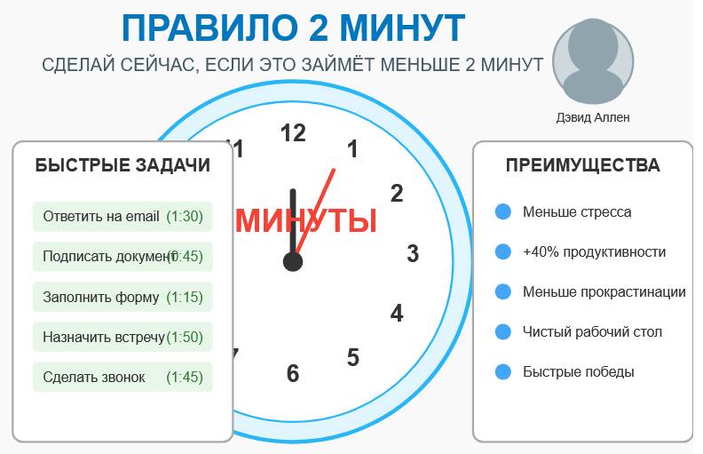 Исследования показывают, что человек, последовательно применяющий правило 2 минут в течение года, экономит в среднем 184 часа продуктивного времени – это почти 23 полных рабочих дня.
