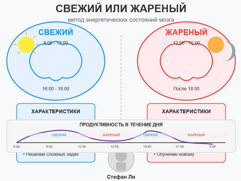 В переводе с английского: свежий или жареный. Автор метода блогер Стефан Ли дает такую характеристику нашему мозгу, состояние которого меняется в течение дня, а вместе с ним и наша продуктивность. То есть с утра вы максимально свежи, но постепенно мозг «поджаривается». Нам остается только выполнить все самое важное, пока мы в наиболее ресурсном состоянии. Как это сделать?