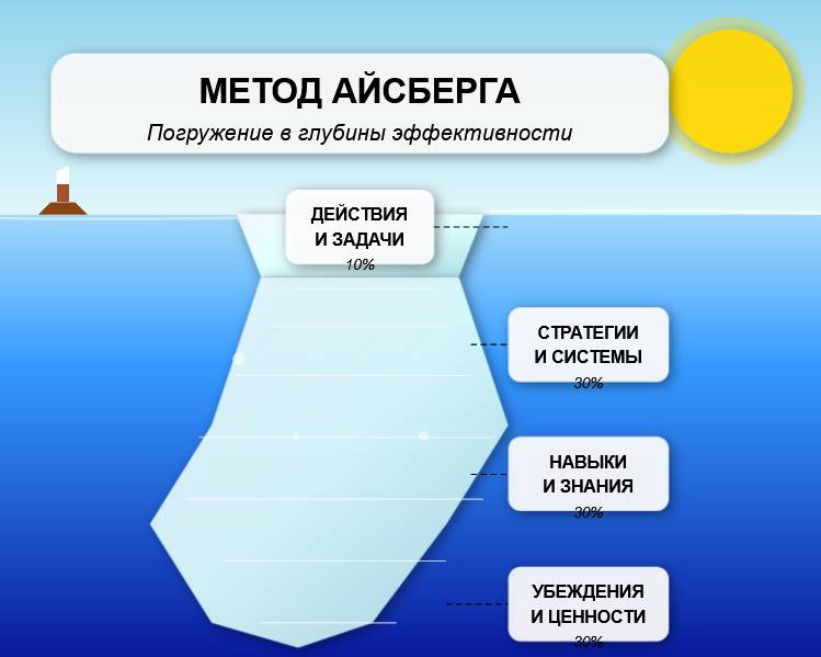 Согласно методу Линдквиста-Моргенстерн, айсберг тайм-менеджмента состоит из четырех уровней: