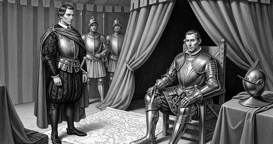 Макиавелли вошел и впервые увидел человека, которому было суждено стать прообразом идеального правителя в его будущей книге. Чезаре Борджиа, восседал за массивным дубовым столом, изучая карты Романьи. Он был одет в темно-красный камзол, расшитый золотом, на поясе висел кинжал с рукоятью, украшенной изумрудами. Его лицо, известное по многочисленным портретам, сочетало в себе аристократическую утонченность с хищным выражением глаз. Его красивое лицо хранило следы перенесенной недавно болезни, однако глаза сверкали твердой решимостью. Высокий, широкоплечий, с проницательными темными глазами и тщательно подстриженной бородкой, он говорил размеренно, но каждое его слово звучало как приказ. Макиавелли, человек небольшого роста, одетый в скромную черную одежду флорентийского чиновника, острым взглядом изучал каждый жест, каждую интонацию своего собеседника.