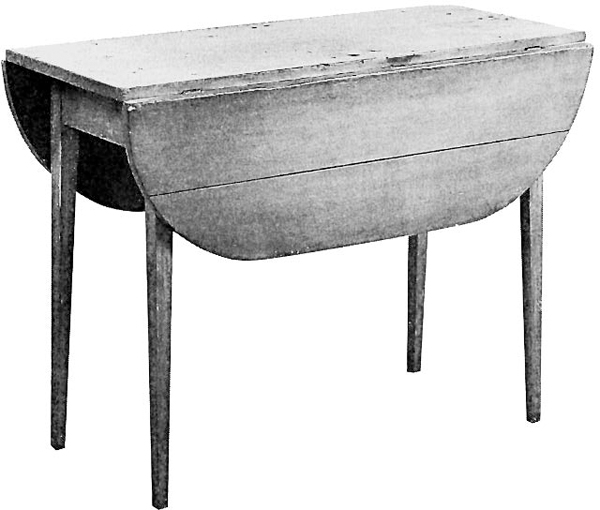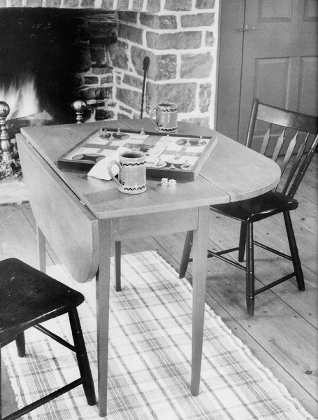 Хотя он был сделан, по-видимому, для применения в качестве кухонного стола, мы используем его в нашей гостиной как столик под лампу. Его почти красный цвет отделки близко подходит общему цветовому стилю комнаты. Из него получился бы замечательный карточный стол: малый вес позволяет легко перемещать его по комнате, а утилитарный вид просто приглашает: «Давай же, используй меня». В сельском доме XIX века он и был разновидностью ломберного стола. С опущенными досками он весьма невелик – всего 457×991 мм (18×39 дюймов), так что его можно легко убрать в сторонку, когда он не используется активным образом. Когда он нужен – для обеда, например, – даже ребенок может выдвинуть его на середину комнаты и поднять откидные доски. В таком виде стол имеет размер квадрата со стороной почти метр (40 дюймов), что вполне достаточно для обеда, карточной игры или игры в «пачиси» (которая в России в свое время называлась «Не сердись, дружок») для четырех человек.