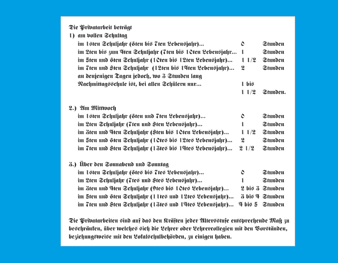 1. Schuljahr (6–7 Jahre)„am vollen Schultag“0 Stunden„am Mittwoch“0 Stunden„über den Sonnabend und Sonntag“0 Stunden2.–4. Schuljahr (7–10 Jahre)„am vollen Schultag“1 Stunde2. Schuljahr„am Mittwoch“1 Stunde2. Schuljahr„über den Sonnabend und Sonntag“1 Stunde3.–4. Schuljahr (8–10 Jahre)„am Mittwoch“1,5 Stunden3.–4. Schuljahr„über den Sonnabend und Sonntag“2-3 Stunden5.–6. Schuljahr (10–12 Jahre)„am vollen Schultag“1,5 Stunden„am Mittwoch“2 Stunden„über den Sonnabend und Sonntag“3-4 Stunden7.–8. Schuljahr (12–14 Jahre)„am vollen Schultag“2 Stunden„am Mittwoch“2,5 Stunden„über den Sonnabend und Sonntag“4-5 StundenZwar machten die Verfasser des Entwurfs eine einschränkende Bemerkung: „Die Privatarbeiten sind auf das den Kräften jeder Altersstufe entsprechende Maß zu beschränken, über welches sich die Lehrer oder Lehrercollegien mit den Vorständen, beziehungsweise mit den Lokalschulbehörden, zu einigen haben.“ Doch rein rechnerisch konnten 14-jährige Schülerinnen und Schüler demnach auf ein erhebliches Arbeitspensum kommen: 34 Schulstunden und drei angenommene Stunden in „Singen, Zeichnen und Turnen“ ergeben 37 Schulstunden oder 27 (Zeit-)Stunden und 45 Minuten; mit weiteren 15 Stunden Hausaufgaben kamen sie damit auf knapp 43 Stunden Schulzeit pro Woche. Vielen Eltern heutiger Ganztagsschüler dürften solche Rechnungen zur wöchentlichen Arbeitsbelastung ziemlich bekannt vorkommen.