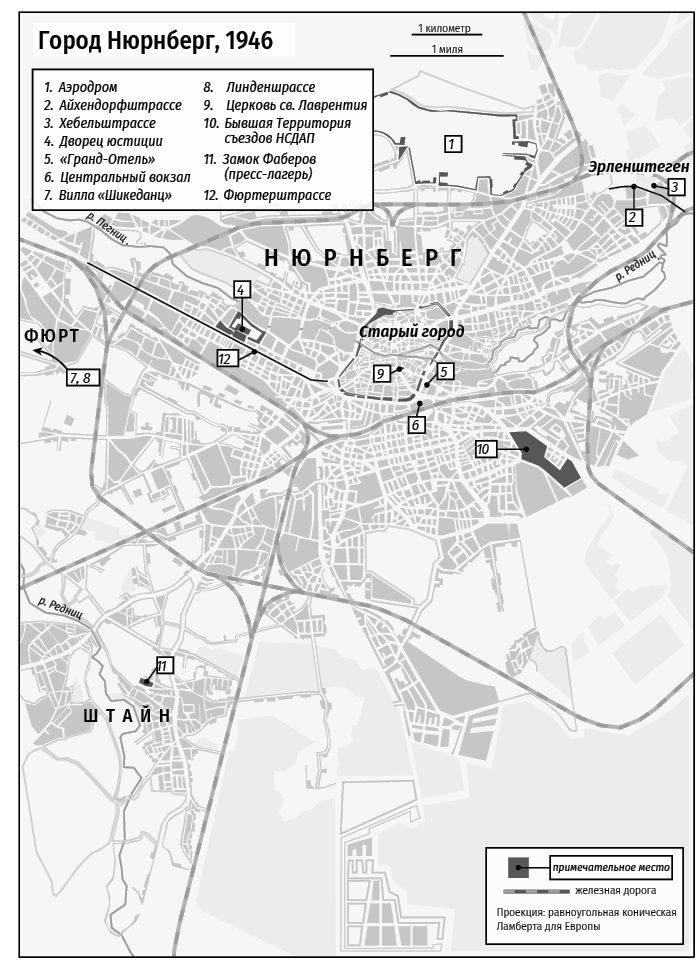 Среди тех, кто приехал наблюдать за судебным процессом, был советский кинорежиссер Роман Кармен – специальный корреспондент советской печати, получивший задание освещать ход суда. В первый день, проезжая в автомобиле через город, Кармен был поражен разрушениями. «Ни одного дома уцелевшего в Нюрнберге не увидишь, – писал он. – Это сплошные руины». Последние годы Кармен работал кинооператором Красной армии и снимал документальные фильмы в Ленинграде, на Дону и на Белорусском фронте. Он видел, что может сделать война. Но его все равно ошеломило увиденное. Нюрнберг почти сравняли с землей периодические бомбардировки союзников и уличные бои. Средневековый центр и современные части города были обращены в кучи щебня и мусора. Перед отъездом из Москвы Кармен смотрел немецкие кинохроники и документальные фильмы, где город представал во всей своей славе под властью нацистов. Он вспоминал сцены, исключительные в своем великолепии, – территорию съездов НСДАП и бесконечные парады частей СС, гитлерюгенда и вермахта. Невозможно было поверить, что это один и тот же город[1].